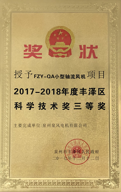 2017年 “FZY-QA小型軸流風(fēng)”機(jī)獲得區(qū)科學(xué)技術(shù)三等獎(jiǎng)。